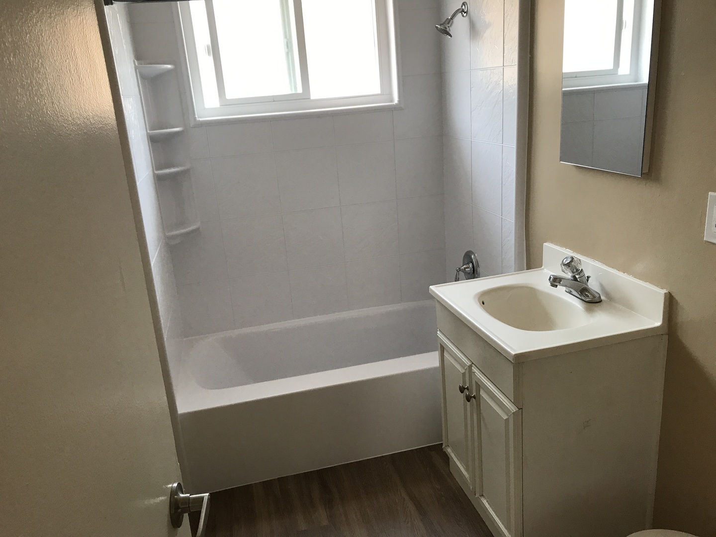 Two Bedroom one bath fully remodeled. You will enjoy the updated paint colors, and new wood floors. The kitchen has new cabinets with quartz counter top. The bath has a new vanity with quartz counter, new tub and tub surround.